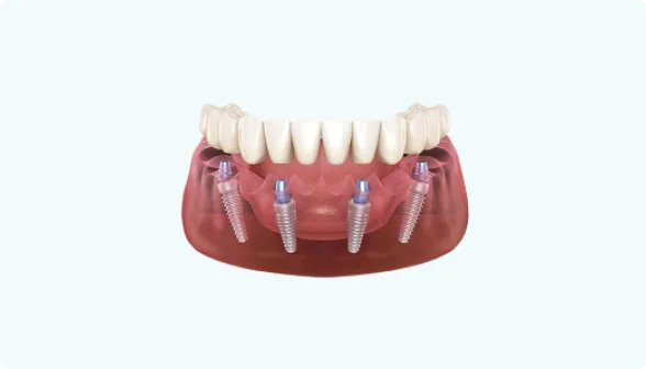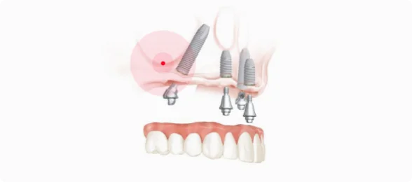 Для восстановления зубного ряда на одной челюсти используем всего четыре имплантата. Два устанавливаем вертикально в передней части челюсти. Ещё два — под углом в боковом отделе, в местах с наибольшим объёмом костной ткани — это даёт протезу надёжную опору.