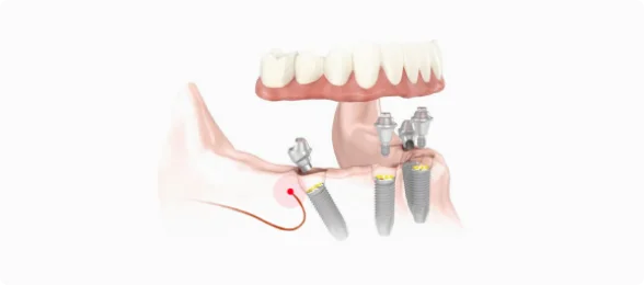 Для восстановления зубного ряда на одной челюсти используем всего четыре имплантата. Два устанавливаем вертикально в передней части челюсти. Ещё два — под углом в боковом отделе, в местах с наибольшим объёмом костной ткани — это даёт протезу надёжную опору. После установки имплантатов фиксируем несъёмный протез