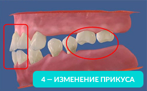 Массовое смещение и выдвижение оставшихся зубов приводит к нарушению прикуса. На 4-ой картинке видно, что положение центральных зубов достаточно ощутимо изменилось, при этом удалённые зубы были расположены далеко от них